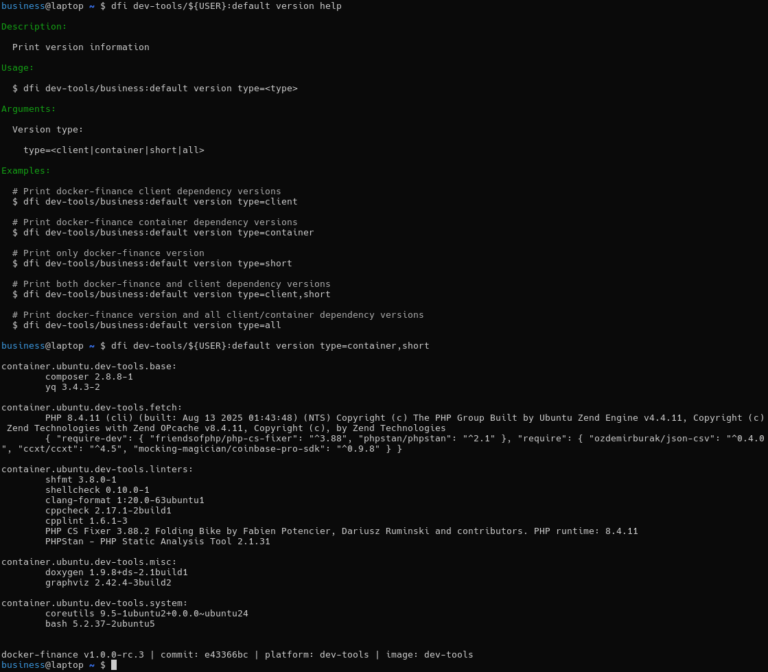 The *finance* in `docker-finance`; as seen from within a running *finance* container; with various types of output.