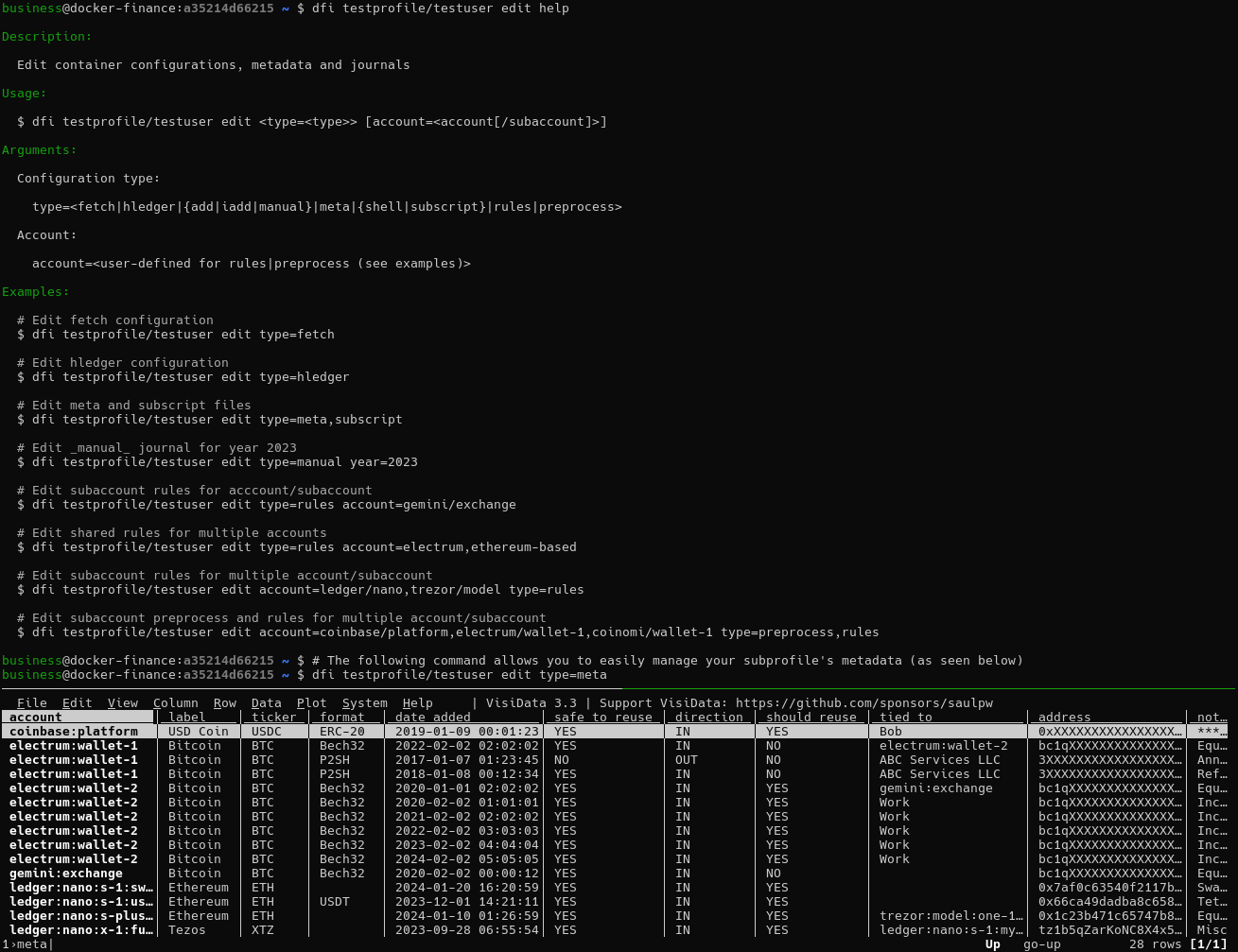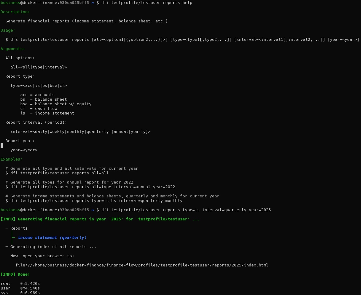 Tax preparation; report generation; metadata management & analysis, and an entire suite of financial tools are easily at your disposal - entirely managed through `dfi`.