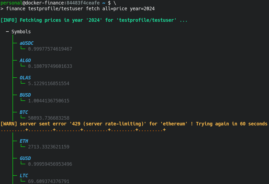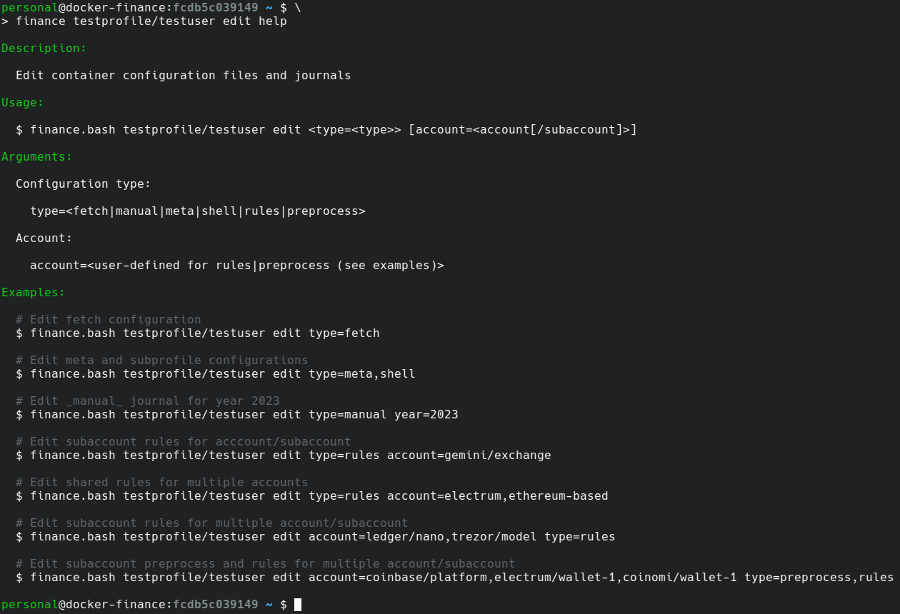 The following assumes that the command docker-finance_dev-tools has been properly aliased, per docker-finance help.