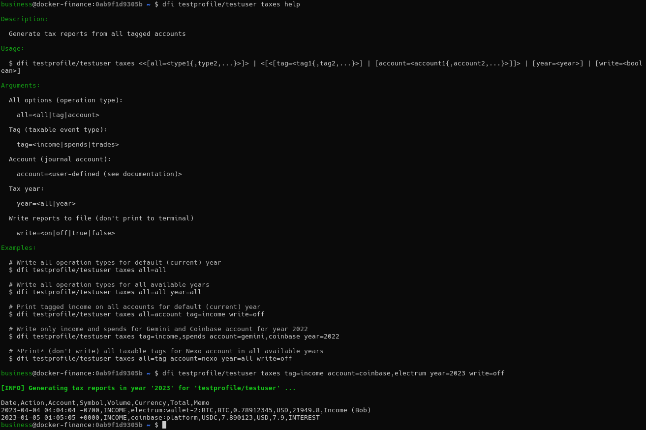 Tax preparation; report generation; metadata management & analysis, and an entire suite of financial tools are easily at your disposal - entirely managed through `dfi`.