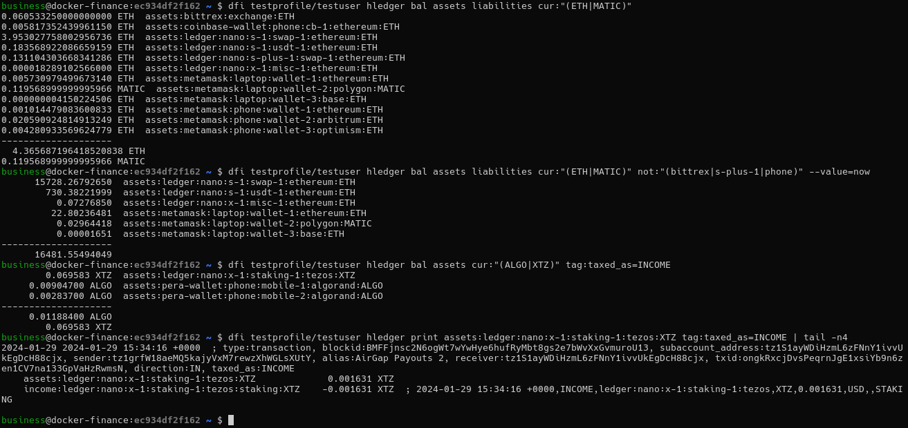 The finance in docker-finance; as seen from within a running finance container; with various types of output.