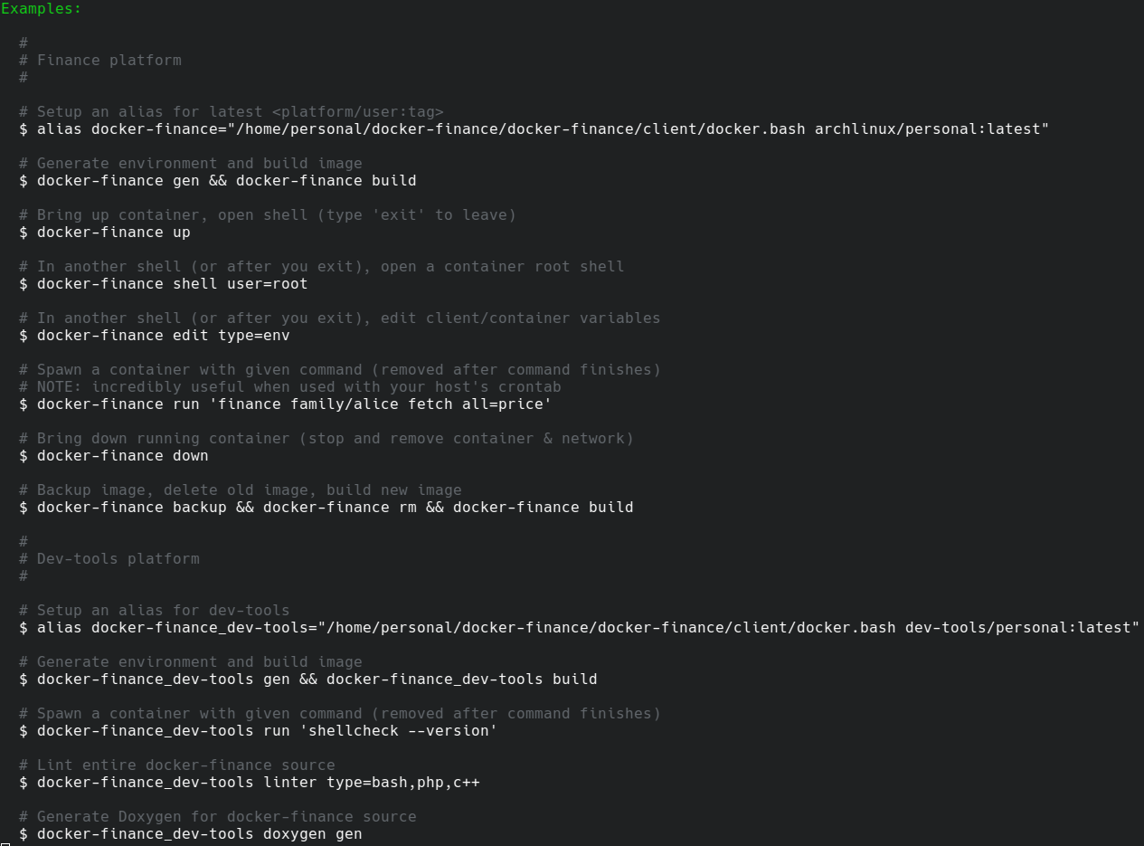 docker-financeneeds the client environment before building the Docker image and spawning the subsequent container (which would rely on volumes). - As described in Mostly-Unified CLI, to use a developer version of the